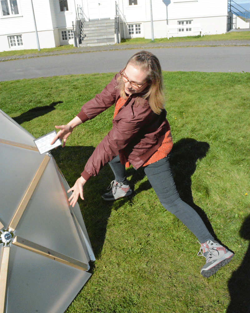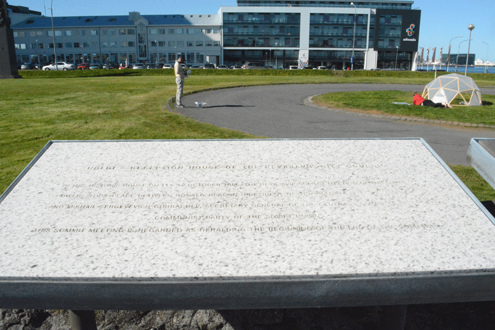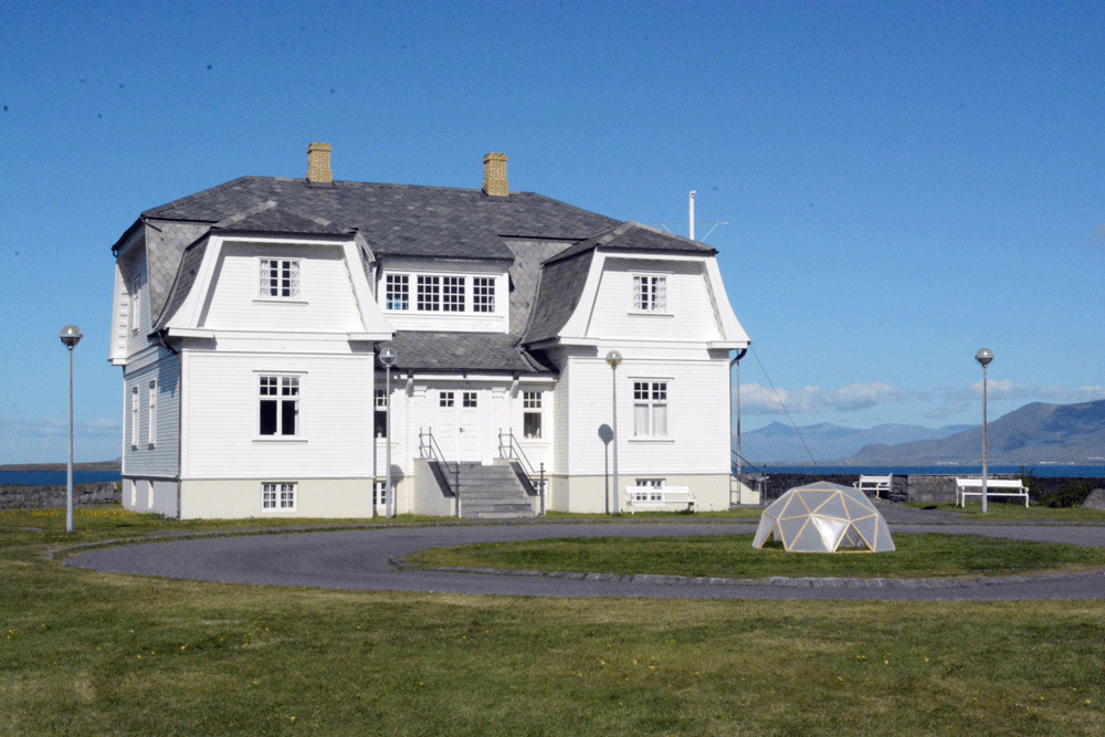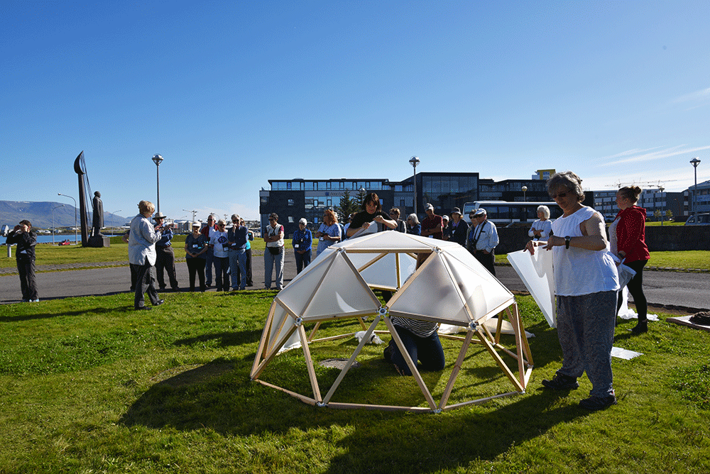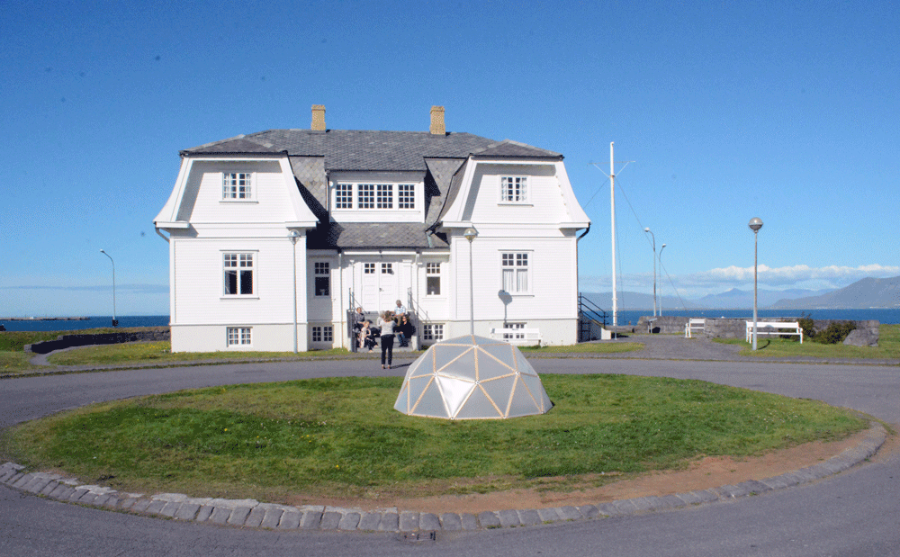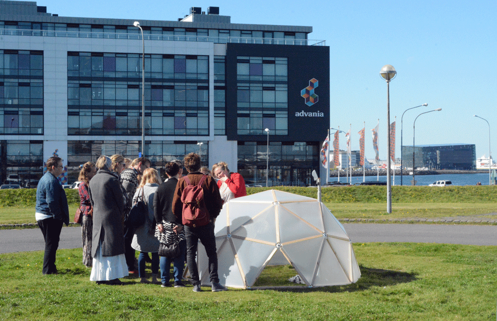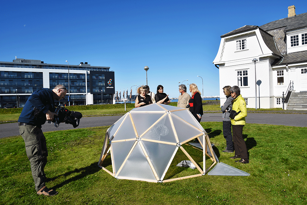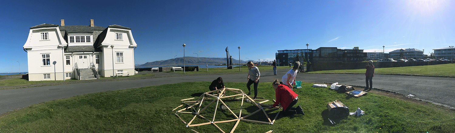 Today the Dome acted as a magnet. We set it up at Höfði House in Reykjavik which was the setting for the summit meeting between Reagan and Gorbachev in 1986 and regarded as the beginning of the end of the Cold War. Most foreign heads of state who visit Iceland come here. A lot of people wrote or drew on the triangles, and we made an audio recording of each students' contribution. We were also filmed for the national TV news, met MA students from the Iceland Academy of Arts and were even filmed by a drone. We've left it up so we can return tonight and take photographs using the UV torches to illuminate the drawings and texts.